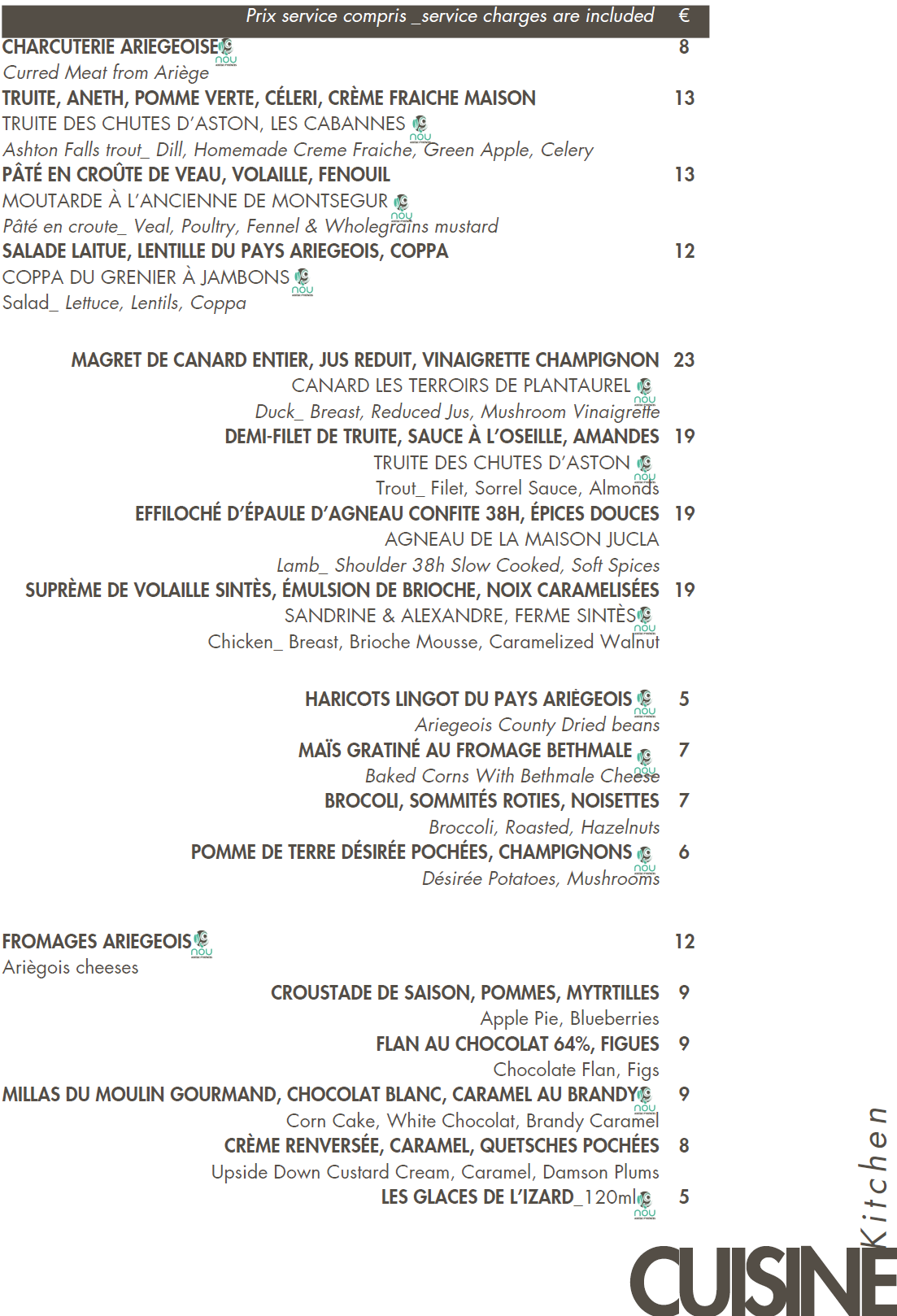 Ici, tout est cuisiné maison à partir de produits frais, issus principalement d’Ariège : une viande d’éleveurs locaux grâce à une filière structurée et engagée, des fromages et charcuteries façonnés par nos agriculteurs et artisans.